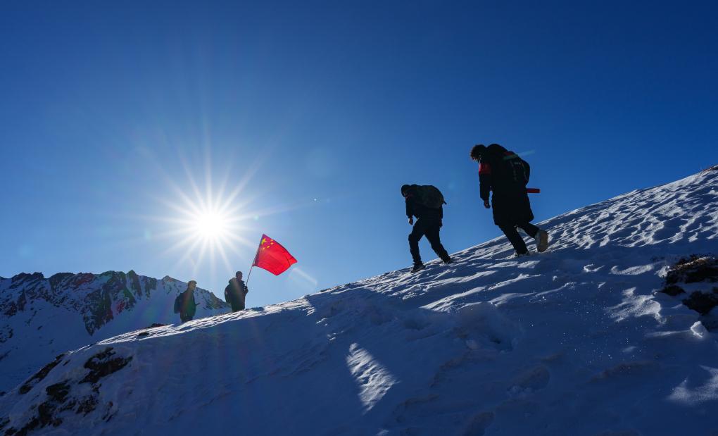 在西藏山南市隆子縣玉麥鄉(xiāng)境內(nèi),護邊員們在雪坡上巡邏(2月6日攝)。新華社記者 丁增尼達 攝
