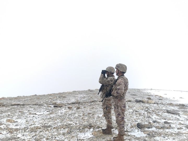 2月15日,西藏軍區(qū)某邊防團(tuán)5592哨所官兵在觀察地形。新華社發(fā)(沈杰 攝)