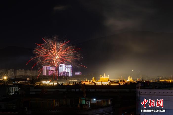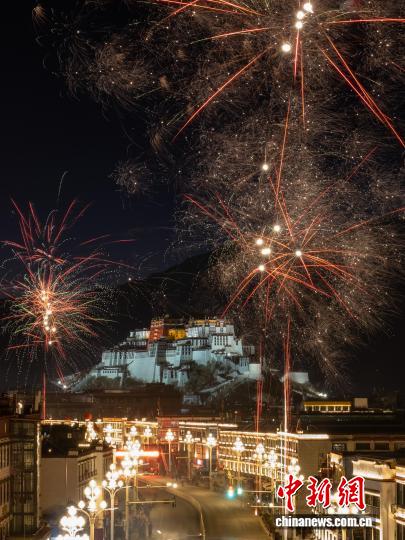 圖為2月16日晚,拉薩北京東路煙花綻放與遠(yuǎn)處的布達拉宮交相輝映。中新社記者 江飛波 攝