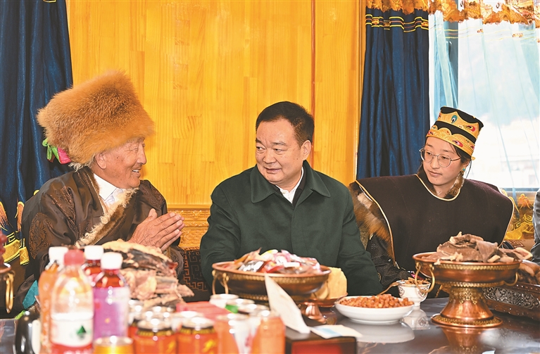 中華民族傳統(tǒng)節(jié)日春節(jié)剛過,雪域高原又迎來了藏歷新年初二,家家戶戶回蕩著“羅薩扎西德勒”的溫馨祝福?!斑^年了,祝你們新年快樂、身體健康、吉祥如意!”王君正走進魯朗鎮(zhèn)扎西崗村77歲的老黨員、致富帶頭人平措家里,嶄新的香布、整潔的小院,切瑪斑斕、卡塞飄香,家里充滿濃濃的年味兒。“身體怎么樣?”“民宿生意好不好?”在暖意融融的客廳里,王君正和老人聊家常,詢問身體狀況及家庭收入等情況,隨后走進平措家的民宿旅館,從價格、住宿條件到屋外山景,看得仔細(xì)、問得深入。了解到在以習(xí)近平同志為核心的黨中央親切關(guān)懷下,扎西崗村發(fā)生了翻天覆地的變化,平措一家借助本地旅游資源,開民宿、做餐飲,年收入不斷增加,日子越過越好,王君正為他們的發(fā)展感到由衷高興、為他們的幸福生活點贊。他說,“看著北斗星走不迷路、跟著共產(chǎn)黨走會幸?!?,這些好日子,離不開以習(xí)近平同志為核心的黨中央對西藏工作的高度重視、對西藏各族人民的深切關(guān)懷,大家要感恩總書記、感謝黨中央,更加堅定不移聽黨話、感黨恩、跟黨走;黨員要發(fā)揮先鋒模范作用,發(fā)揚黨的光榮傳統(tǒng)和優(yōu)良作風(fēng),帶領(lǐng)村民用勤勞的雙手把家園建設(shè)得更加美好,把日子過得更加甜蜜。
