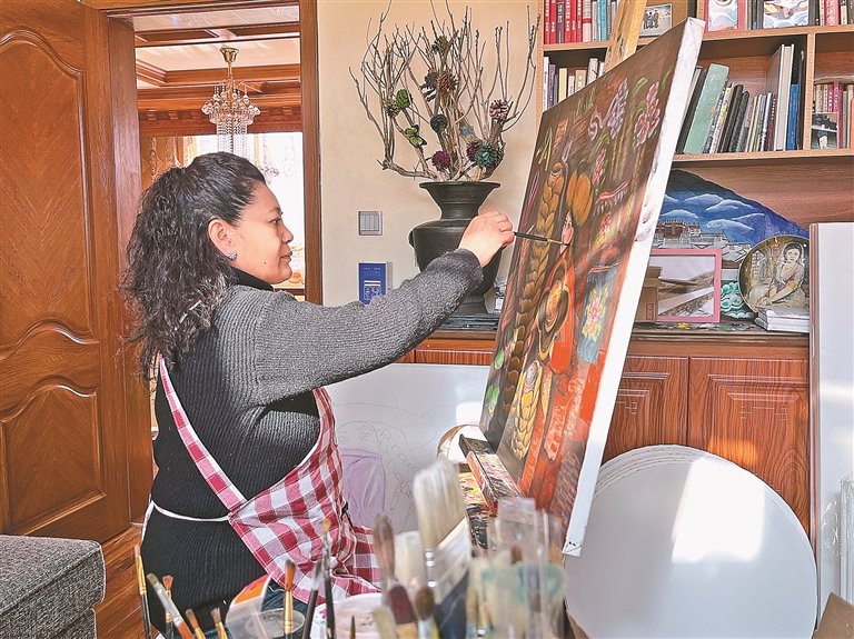 圖為唐瑟達(dá)娃在作畫(huà)。記者 盧文靜 攝