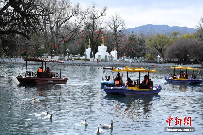3月8日,西藏拉薩宗角祿康公園,市民乘游船賞春。陽(yáng)春三月,古城拉薩楊柳發(fā)芽、桃花初放,春意漸濃。中新社記者 貢嘎來(lái)松 攝