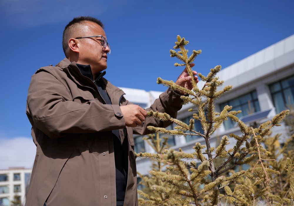 3月20日上午10點30分,扎西像往常一樣來到市科技局的院子里,仔細(xì)查看樹木的長勢。他彎腰伸手,摸了摸樹的葉子和枝條,又踩了踩樹下的土壤。“越冬情況總體穩(wěn)定,也有了返青跡象,可以開始澆水、施肥了。”扎西欣喜地說。