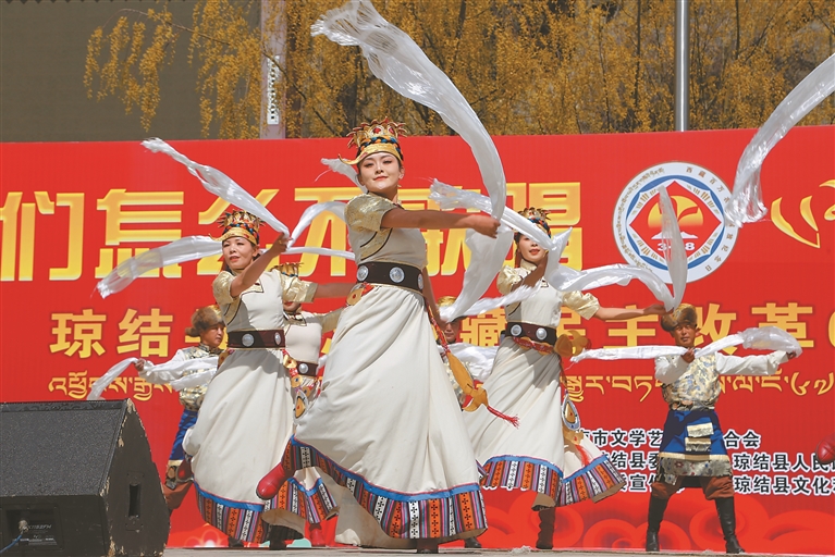 圖為3月27日,山南市瓊結(jié)縣青瓦達(dá)孜廣場(chǎng)上歡歌笑語、人頭攢動(dòng)。為紀(jì)念西藏民主改革67周年,一場(chǎng)以“叫我們?cè)趺床桓璩睘橹黝}的文藝演出在此舉行。圖為活動(dòng)演出現(xiàn)場(chǎng)。倫珠澤仁 記者 白瑪澤旺 攝