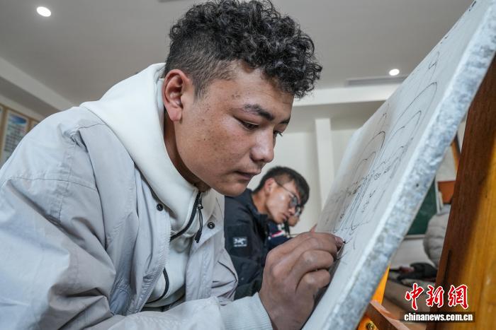 圖為學(xué)生進(jìn)行唐卡的起稿。貢確 攝