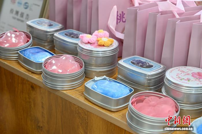 圖為桃花世界體驗中心內(nèi)的桃仁油香皂等產(chǎn)品。謝牧攝