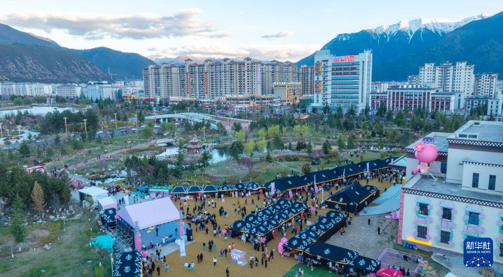 這是4月3日拍攝的林芝第二十三屆桃花旅游文化節(jié)“堆春行動”集市現(xiàn)場(無人機(jī)照片)。新華社記者 丁增尼達(dá) 攝