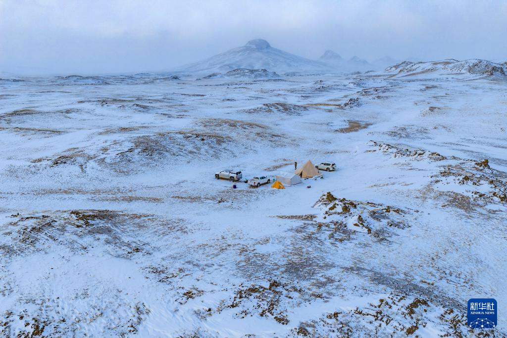 4月11日,羌塘國(guó)家級(jí)自然保護(hù)區(qū)那曲地區(qū)管理局專業(yè)管護(hù)隊(duì)在“巴毛窮宗”地區(qū)雪中宿營(yíng)(無(wú)人機(jī)照片)。新華社記者 姜帆 攝