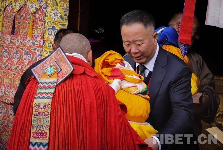 圖為西藏自治區(qū)政府副秘書(shū)長(zhǎng)高寶軍向獲得學(xué)位的考僧贈(zèng)送五彩緞、干果、袈裟 攝影:賈華加
