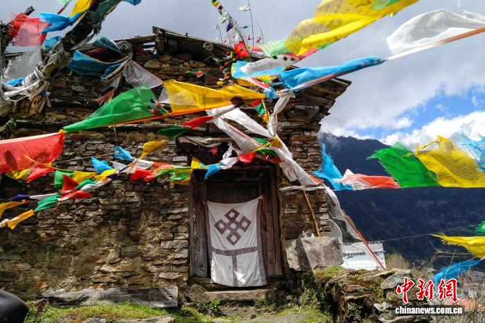 資料圖為位于西藏自治區(qū)山南錯那市勒布溝的倉央嘉措故居,周圍被藏傳佛教信眾掛滿祈福經幡。中新社記者 江飛波 攝
