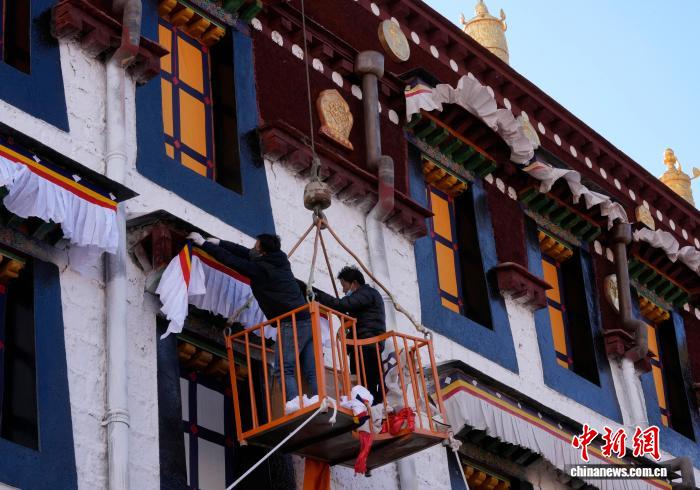 2月5日,西藏大昭寺更換“香布”,迎藏歷新年?!跋悴肌笔遣厥浇ㄖ难b飾,通常用五彩棉布縫制,主體為白色,搭配紅藍(lán)黃等色的邊沿,對窗沿等的顏料及木構(gòu)件起到保護(hù)作用。圖為工人們正乘坐吊車更換大昭寺“香布”。中新社記者 李林 攝