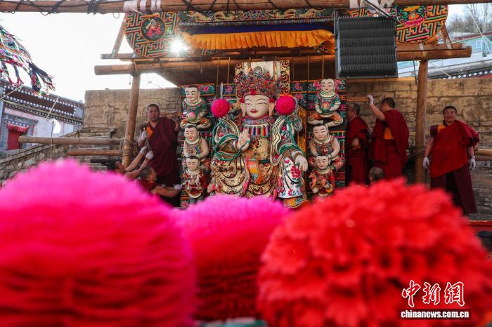 3月3日,青海省西寧市湟中區(qū)塔爾寺僧人將上花院的酥油花主尊——文殊菩薩固定在花架上。 馬銘言 攝