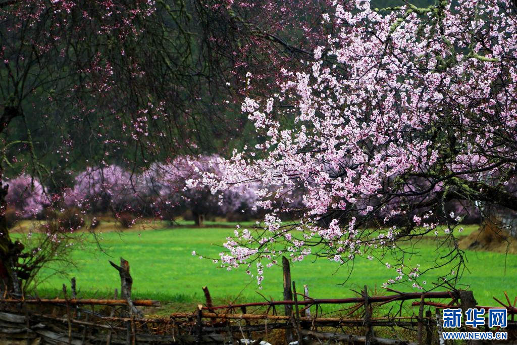 圖為西藏波密縣傾多鎮(zhèn)巴康村內,桃花映襯下的綠草。新華網(wǎng)發(fā) 阿旺仁青 攝