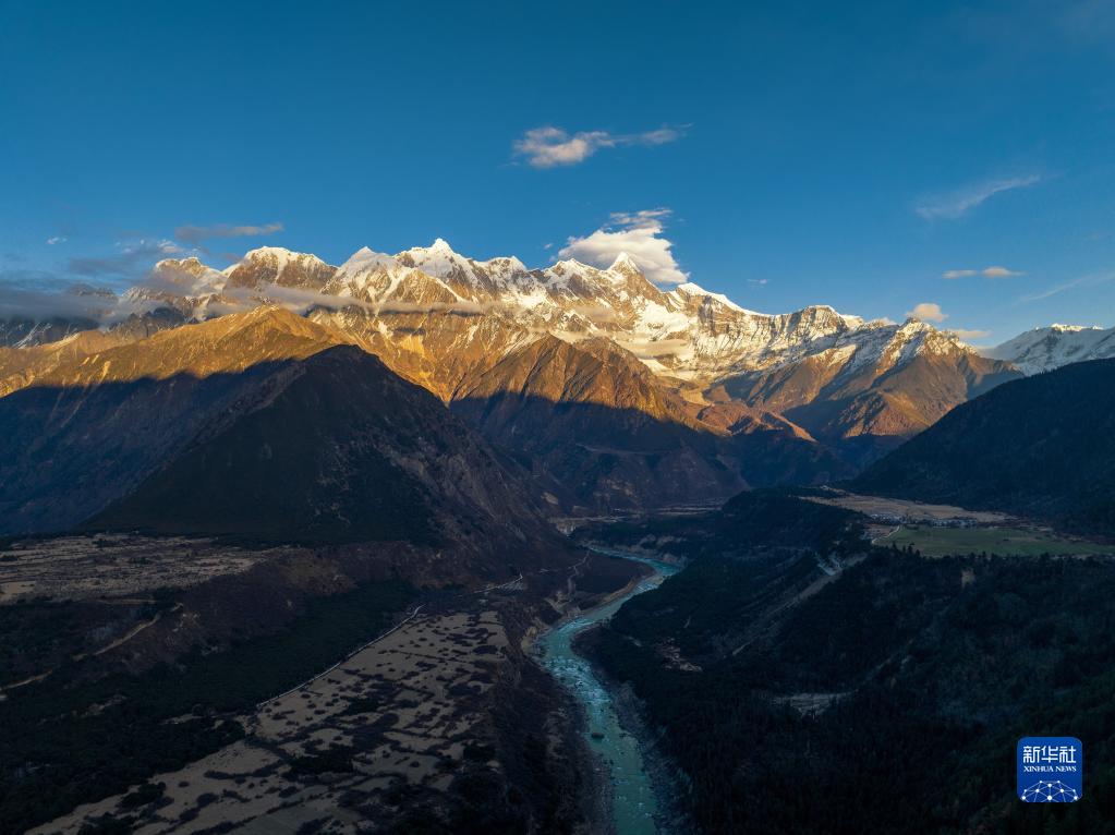 南迦巴瓦峰和山腳下的村莊(11月28日攝,無(wú)人機(jī)照片)。新華社發(fā)(董志雄 攝)