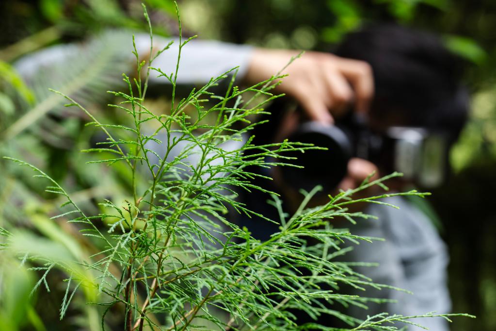 6月15日,中國科學院植物研究所博士研究生王孜在亞洲第一高樹旁拍攝一株西藏柏木的小樹苗。