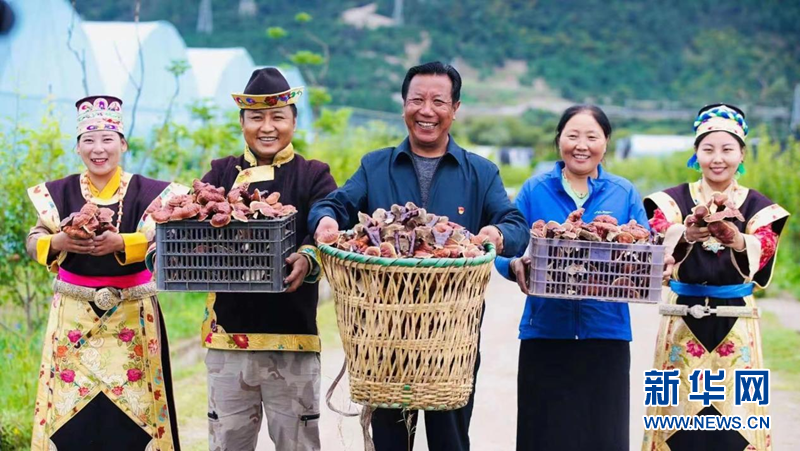 圖為紅太陽(yáng)科技示范家庭農(nóng)場(chǎng)創(chuàng)始人尼瑪帶著村民慶祝靈芝豐收。(紅太陽(yáng)科技示范家庭農(nóng)場(chǎng)供圖)