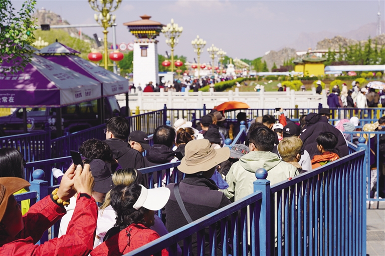 “你喜歡‘特種兵式旅游’還是‘城市漫游’呢?”面對(duì)記者的問題,身著民族服飾正在拍照的伍女士回答:“我本人更喜歡‘城市漫游’,畢竟年紀(jì)大了。‘特種兵式旅游’太累了,可能不適合我?!蔽榕縼碜运拇ǎ衲?3歲,喜歡旅行的她經(jīng)常約著好朋友四處走走?!斑@次進(jìn)藏,我們打算就在拉薩待著,逛逛拉薩的大街小巷、博物館、夜市。了解一座城市的文化、歷史,比匆忙的旅行更有趣。”
