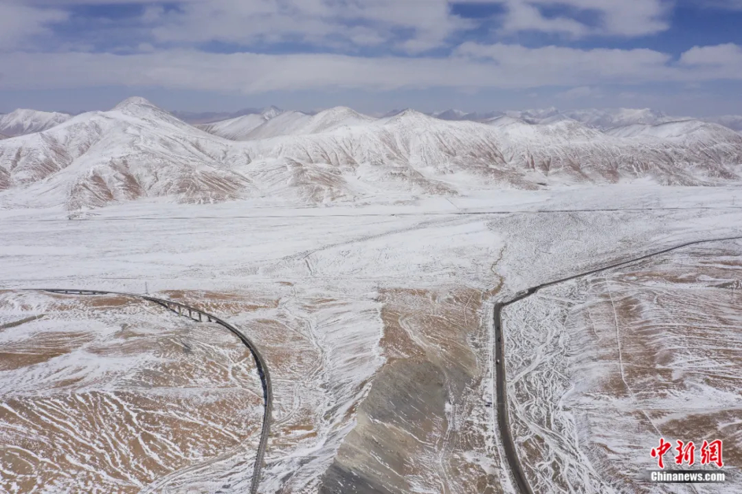 2023年3月25日,航拍位于青海省海西蒙古族藏族自治州境內(nèi)的青藏公路(右)和青藏鐵路。中新社記者 馬銘言 攝