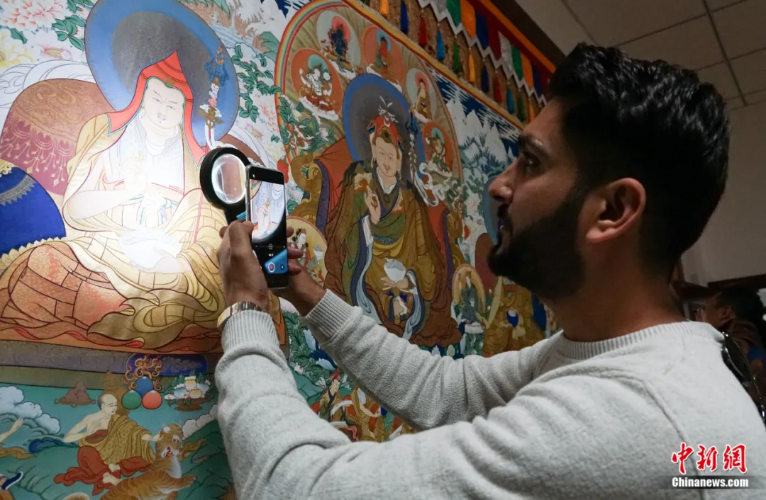 2023年9月13日,在青海省黃南藏族自治州同仁市熱貢畫院內(nèi),外國(guó)游客前來參觀。中新社記者 馬銘言 攝