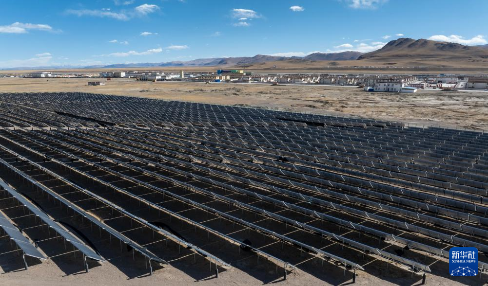 鳥瞰措勤縣城區(qū)清潔能源集中供暖特許經(jīng)營項(xiàng)目的光伏陣列(無人機(jī)照片,11月20日攝)。新華社記者 姜帆 攝 ??