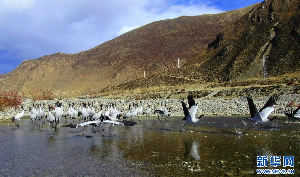 圖為黑頸鶴在嬉戲(11月24日攝)。新華網(wǎng)發(fā) 次昂攝 ??
