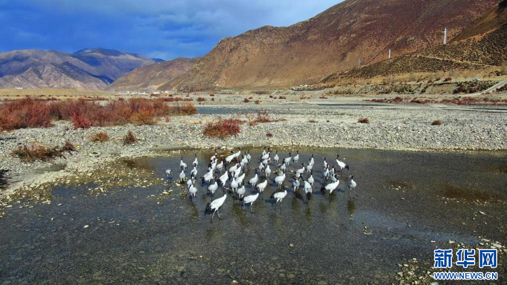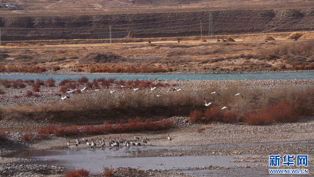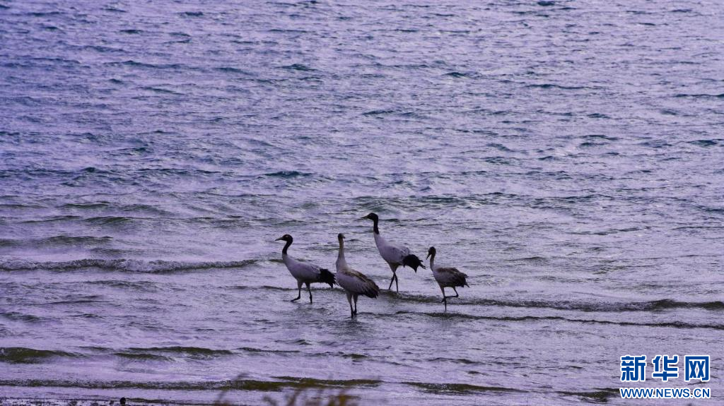 圖為岸邊的黑頸鶴(11月24日攝)。新華網(wǎng)發(fā) 嘎色攝 ??