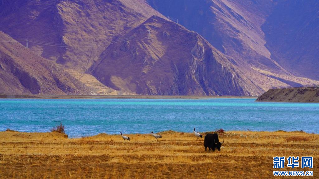 圖為湖邊的黑頸鶴與牦牛(11月24日攝)。新華網(wǎng)發(fā) 嘎色攝 ??