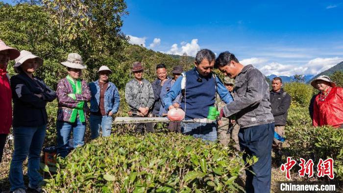 圖為技術(shù)專家詳細講解茶樹修剪的科學方法。墨脫縣人力資源和社會保障局供圖