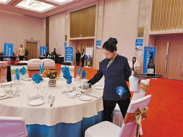 圖為餐廳服務(wù)比賽現(xiàn)場,選手正在以規(guī)范動作進(jìn)行擺盤(杯)、桌花、倒酒等環(huán)節(jié)比賽。記者 孫開遠(yuǎn) 攝