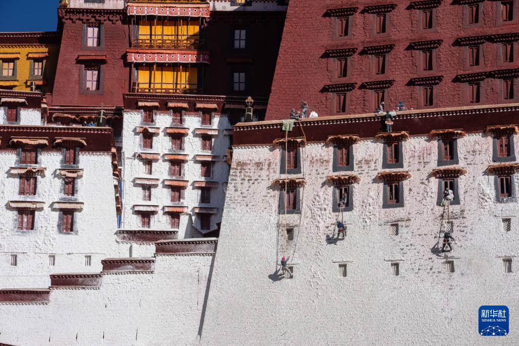 10月30日,布達(dá)拉宮管理處的工作人員在噴灑涂料。新華社記者 旦增尼瑪曲珠 攝