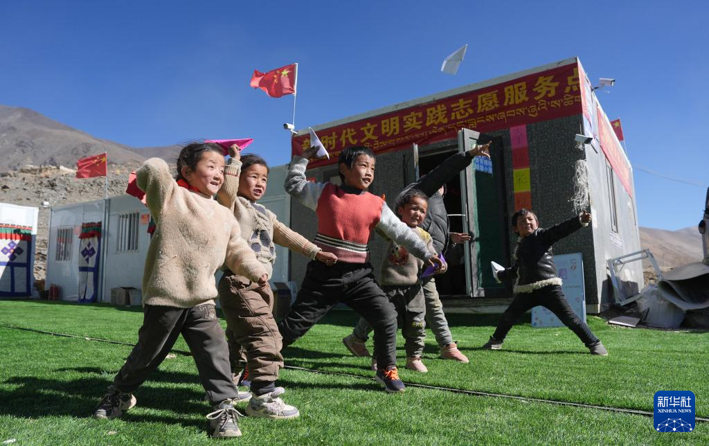1月24日,定日縣古榮村安置點(diǎn)的孩子們?cè)诜棚w紙飛機(jī)。新華社記者 晉美多吉 攝