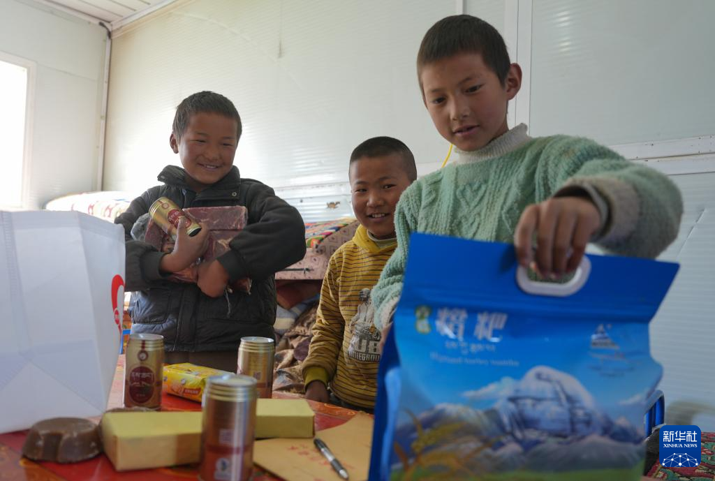 1月27日,拉孜縣加嘎村安置點(diǎn)受災(zāi)群眾領(lǐng)到新年大禮包。新華社記者 晉美多吉 攝?