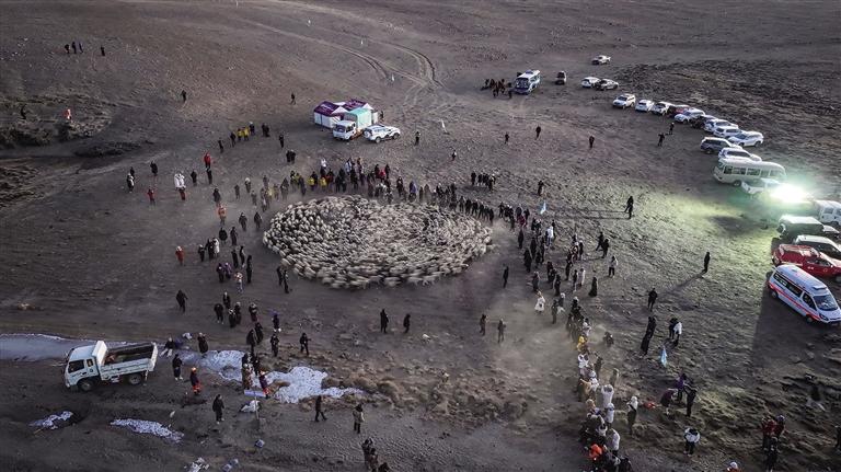 兩名牧羊人牽著威風(fēng)凜凜的牧羊犬,和其他牧羊人分別守在羊群兩側(cè),時(shí)刻維持著隊(duì)伍的秩序。隨著時(shí)間推移,原本泛紫的天空漸漸被日出的光輝染成絢麗的紅色,霞光輕柔地灑在湖邊連綿起伏的雪山上,為雪山勾勒出一圈溫柔的金色輪廓。冰湖上,羊群與牧羊人的身影在晨光的映照下被無(wú)限拉長(zhǎng),宛如一幅徐徐展開(kāi)的古老畫卷,靜謐而美好。