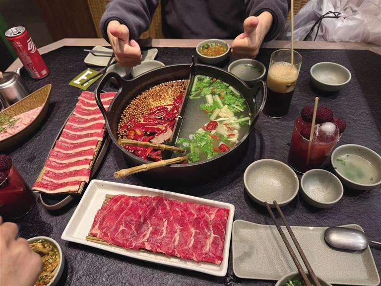 市民普布倉決趁著假期回家,想好好招待親朋好友,思來想去,火鍋店成了她的首選。普布倉決打聽了多家人氣火爆的火鍋店鋪后得知,不少店鋪在春節(jié)期間都推出了新春活動(dòng)和新菜品。于是,她預(yù)訂了一間包廂,和親朋們一同享用火鍋。她笑著說:“春節(jié)期間,我連續(xù)參加了3場‘火鍋局’。我覺得火鍋可不只是滿足味蕾,更是親朋好友之間情感交流和社交互動(dòng)的好方式?!?/p>