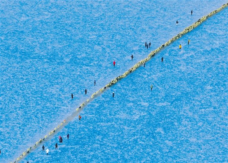 清晨,當(dāng)?shù)谝豢|陽光灑在冰面上,牧民便開始了他們的旅程。穿著傳統(tǒng)服飾的老爺爺帶頭驅(qū)趕著羊群踏上冰面。羊群沿著爐灰鋪成的小路緩緩前行,宛如一條長長的金色線條,在藍(lán)冰上勾勒出一幅亮麗畫卷。途中,偶爾會有小羊因冰面濕滑而摔倒,牧民總是及時將它們扶起,或背或抱地送到島上。