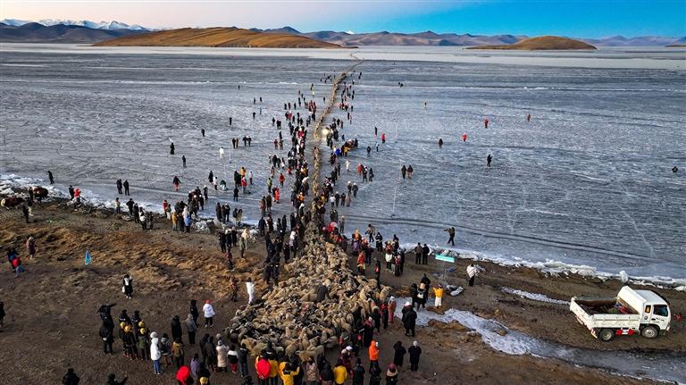 2月7日凌晨,西藏山南市浪卡子縣打隆鎮(zhèn)推瓦村旁的普莫雍措湖面上,夜色未退,一群村民打著手電筒,沿著用牛糞灰鋪就的冰路,穩(wěn)步將數(shù)百只羊趕往湖心島。這一延續(xù)千年的“冰湖趕羊”傳統(tǒng),是當?shù)啬撩衽c自然和諧共處的智慧碩果,也承載著普莫雍措獨特的歷史記憶。在這里,冰面的湛藍裂紋、牧羊人的質(zhì)樸堅守與游客的由衷贊嘆相互交融,共同講述著有關(guān)生存、傳承和敬畏自然的故事。“在父輩、祖輩那時候,羊群是村民們賴以生存的根本;如今,趕羊活動帶來的旅游熱潮依然是大家維持生計的重要支撐。所以,我想跟推瓦村的年輕人說,一定不要忘記這項傳統(tǒng),不要舍棄這些給我們帶來富足生活的羊群?!蔽榻鸬┰鰸M懷深情地說道。