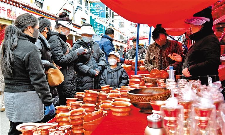 圖為市民群眾在年貨市場購買藏式木碗。記者 曲珍 攝