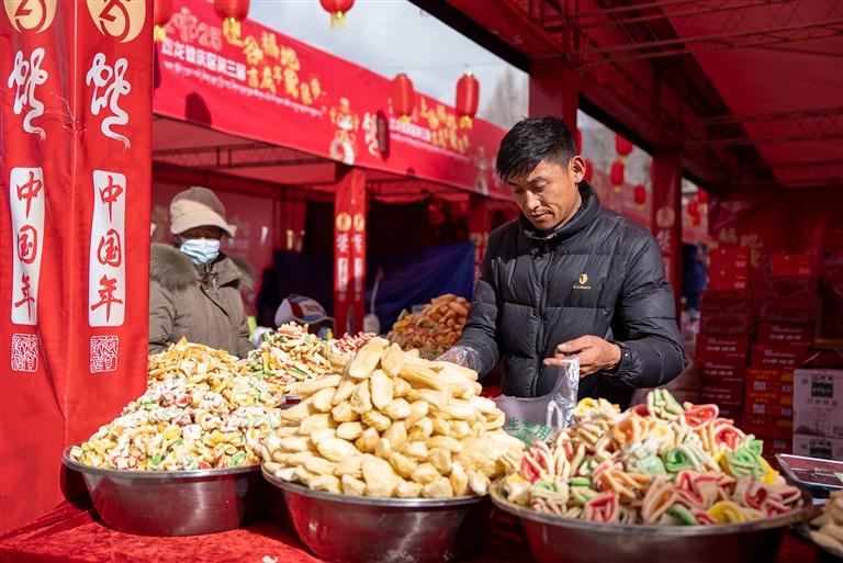 活動(dòng)當(dāng)天,記者來(lái)到位于拉薩市城關(guān)區(qū)蔡公堂街道恩惠苑社區(qū)翰林苑小區(qū)附近的年貨市場(chǎng),只見(jiàn)現(xiàn)場(chǎng)人聲鼎沸。150個(gè)攤位整齊排列,各類年貨商品琳瑯滿目,讓人目不暇接。這里有糖果、堅(jiān)果、酥油、卡塞等傳統(tǒng)食品,有豬肉、牛肉干、羊肉等肉類制品,還有臘味熟食、奶渣餅等特色小吃,以及藏文對(duì)聯(lián)、喜慶裝飾、廚具餐具等日用百貨,完全能滿足居民群眾一站式的年貨購(gòu)物需求。