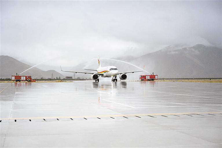 援藏入境旅游包機(jī)在日喀則和平機(jī)場(chǎng)過“水門”。