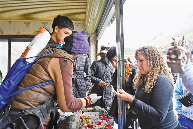 新奇感過后,游客們開啟購物模式?!鞍⒓?,這個(gè)掛飾可以定制嗎?”“你們可以發(fā)快遞嗎?”對(duì)于一連串的問題,阿佳格桑忙碌地一一回答著,“你們想要什么圖形,我們就給你定制什么圖形?!薄拔覀冞@兒快遞很快,今天下單明天就給你發(fā)!”短短半個(gè)小時(shí),“阿佳格桑工坊”的生意火爆,銷售藏式靠墊、藏式地毯、掛飾等特色產(chǎn)品4000多元?!盎厝ズ?,我要通過自媒體平臺(tái),宣傳這次西藏之旅的所見所聞,讓更多親朋好友來西藏旅游!”日本游客琴音有感而發(fā)。