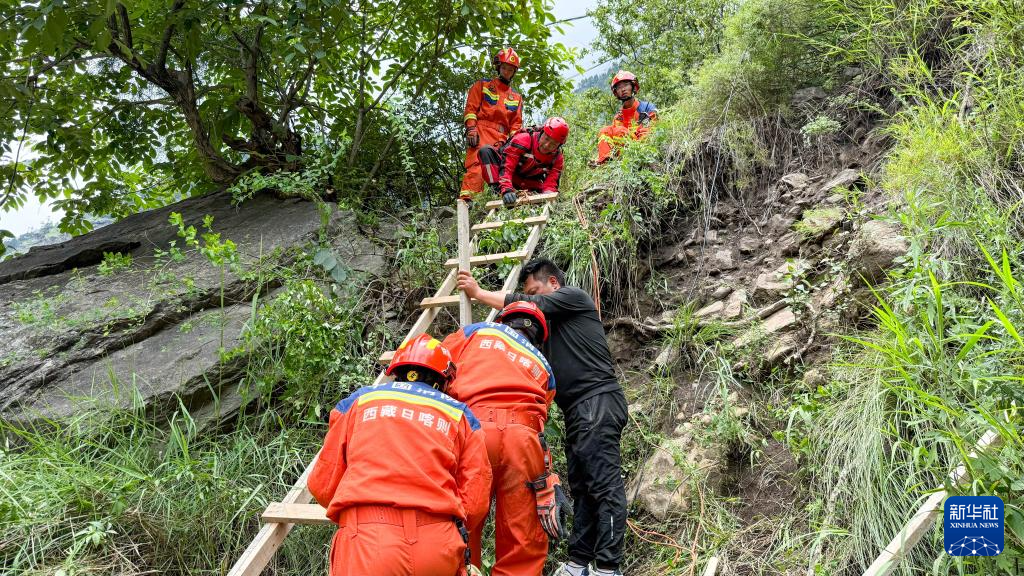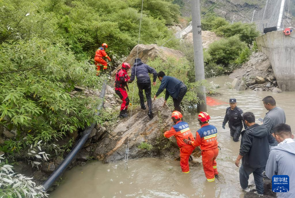 7月8日,西藏消防救援總隊(duì)救援人員在救災(zāi)現(xiàn)場(chǎng)搭建救援通道。新華社發(fā)(徐達(dá)富攝)??
