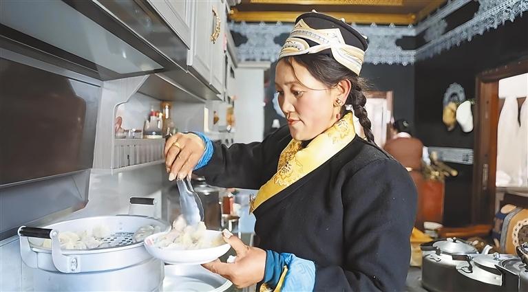 圖為朗縣拉丁雪村村民堅阿措姆在嶄新的廚房里忙著盛裝熱氣騰騰的牛肉包子。 記者 謝筱純 攝