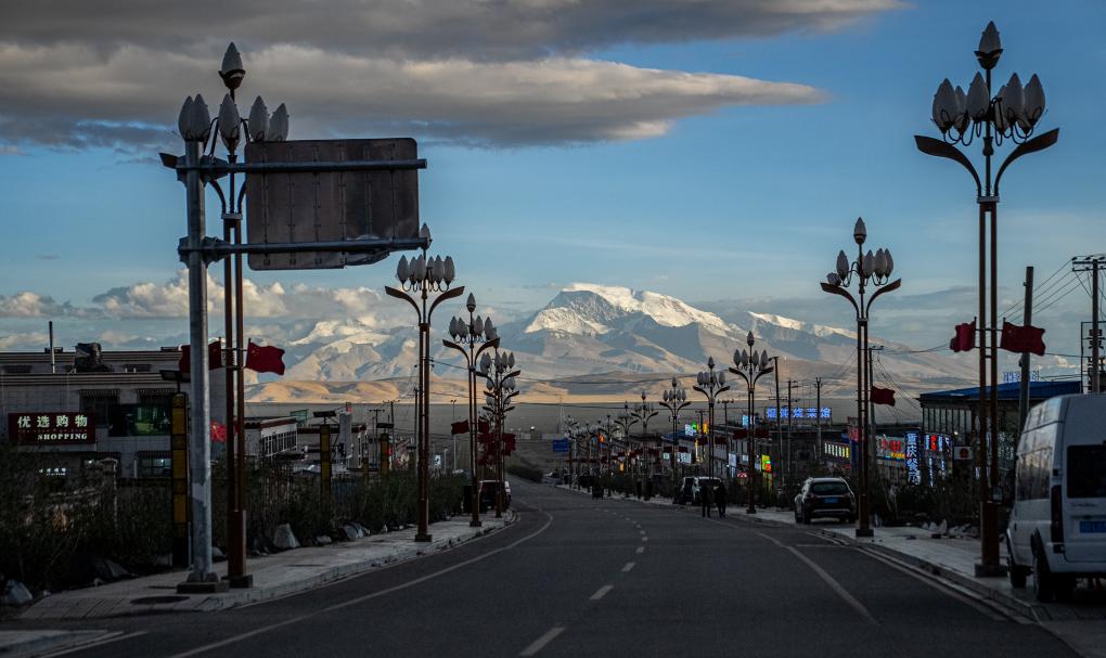 塔爾欽小鎮(zhèn)中心街道南望,可見終年積雪的納木那尼峰。新華社記者 丁增尼達(dá) 攝