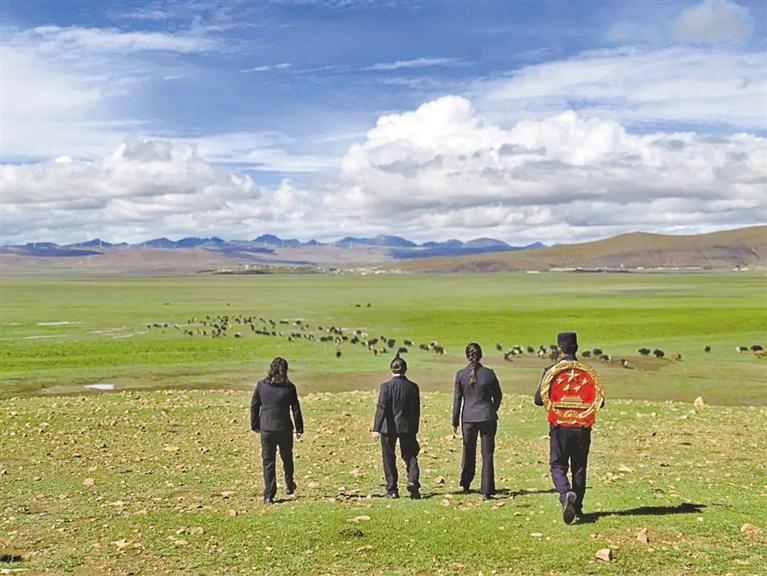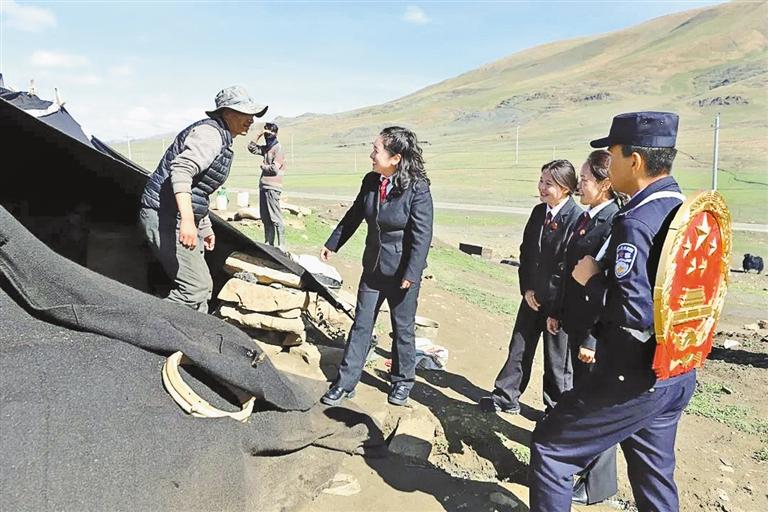 在廣袤的草原深處,牧民群眾的黑帳篷與成群的牛羊構(gòu)成人與自然和諧共生的畫卷。措美縣人民法院干警來到放牧點(diǎn),圍坐于牧民群眾間,用通俗易懂的語言打開話匣子?!按笫?,您看這草場上的植被,要是過度放牧,來年就長不出這么好的草了,牛羊沒了口糧,咱們的日子也受影響不是?”