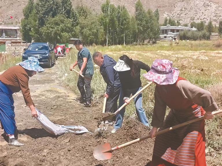 圖為山南市商務(wù)局駐村工作隊(duì)隊(duì)員和村民一起修整田間道路,方便人員和車輛通行。