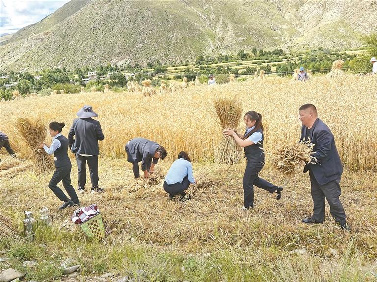 圖為農(nóng)行山南分行“格?;ā苯鹑诜?wù)隊(duì)隊(duì)員幫助群眾收割青稞。