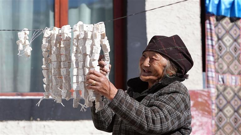 74歲的洛桑塔杰坐在庭院里,正專(zhuān)注地編織牦牛項(xiàng)圈。彩色繩線在他指尖翻飛纏繞,漸漸勾勒出別致紋路。不遠(yuǎn)處,他的老伴在晾曬奶渣,潔白的顆粒在陽(yáng)光下泛著誘人光澤,兩位老人的臉上滿是藏不住的幸福笑意。“家里170多頭牲畜由兒女照管,我們閑時(shí)就做點(diǎn)手工活解悶?!?洛桑塔杰笑著打開(kāi)話匣子,“今年多虧村委會(huì)發(fā)放了7頭適齡母牦牛,還帶領(lǐng)大家加入村集體牦牛養(yǎng)殖項(xiàng)目。我學(xué)會(huì)了科學(xué)飼養(yǎng)技術(shù),年底能分紅,牛奶、酥油、奶渣自己吃不完還能賣(mài),日子過(guò)得充實(shí)又紅火!”