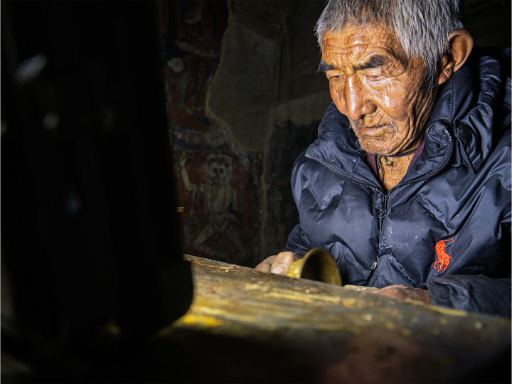 到阿旺家里時(shí),他正一個(gè)人坐在自己家中,他的腿腳已不能支持他每天爬升近200米高的山路。2005年起,考慮到阿旺老人的身體情況,當(dāng)?shù)卣疀Q定由東嘎村的村民輪流擔(dān)負(fù)起日常守護(hù)職責(zé),但阿旺老人始終堅(jiān)持指導(dǎo)年輕人如何保護(hù)洞窟,自己也盡可能地多去石窟看看。“以前腿腳好的時(shí)候幾乎每天都去,現(xiàn)在腿腳真的不行了,今年我只上去了三次。”阿旺老人說(shuō)出這話的時(shí)候,嘴角帶些苦笑。