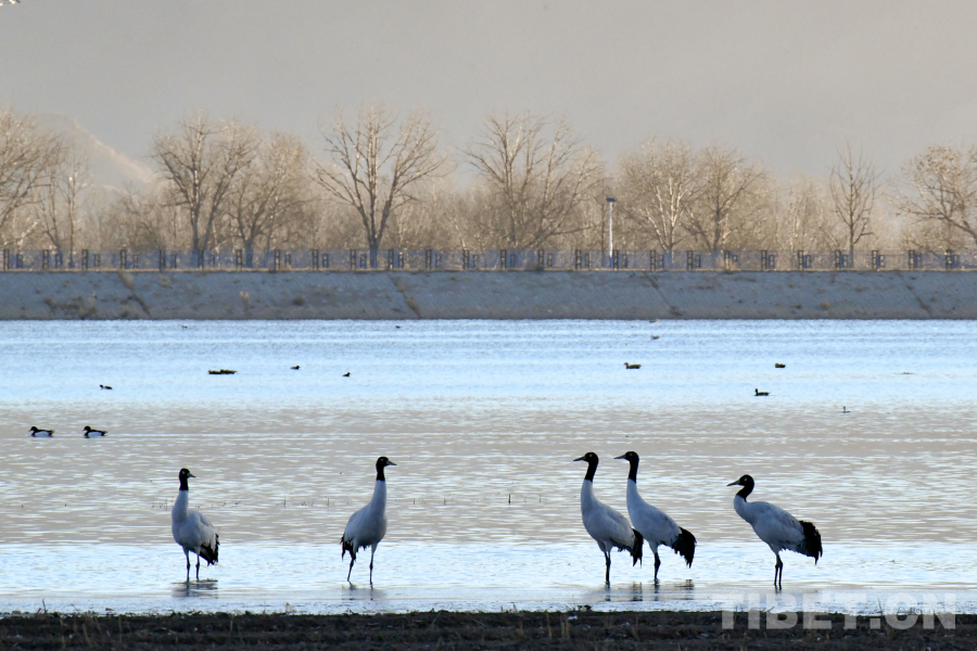 圖為拉薩市林周縣卡孜水庫內(nèi)越冬的黑頸鶴(攝于11月23日)攝影:趙振宇