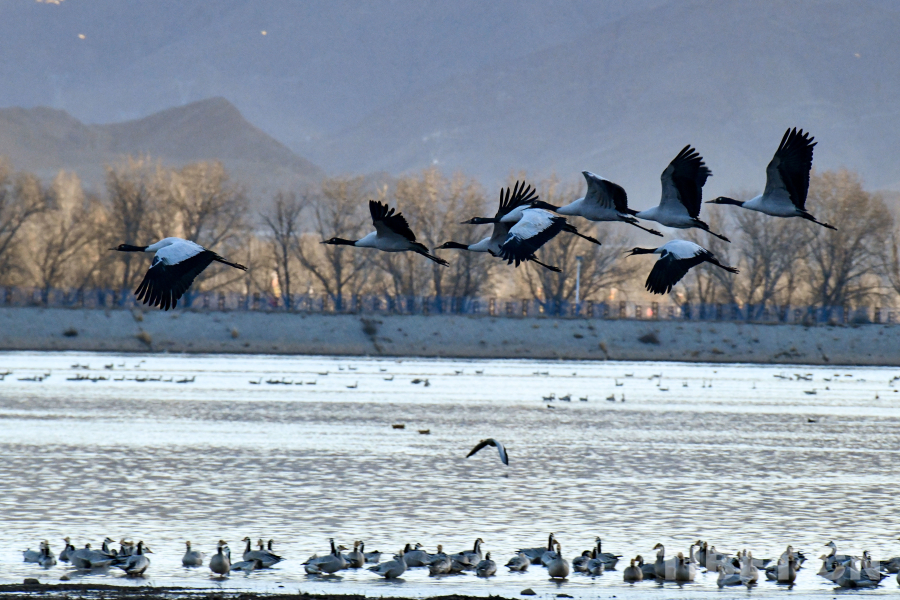 作為高原濕地生態(tài)的“指示物種”之一,黑頸鶴的保護成效直接反映著西藏生態(tài)保護的深度與廣度。拉薩市林草局介紹,為保護這一珍稀物種,西藏自治區(qū)于2003年設(shè)立西藏雅魯藏布江中游河谷黑頸鶴國家級自然保護區(qū)。2003年以來,累計投入5012.71萬元,實施林業(yè)草原生態(tài)保護資金雅江中游河谷黑頸鶴國家級自然保護區(qū)(拉薩片區(qū))8個保護修復(fù)項目,并嚴格落實野生動物疫源疫病監(jiān)測零報告和24小時巡護制度,加強日常巡護管理。為了確保黑頸鶴順利越冬,拉薩市每年落實專項資金用于購買食物,并專門設(shè)立多個定期投食點,安排專人投撒青稞、小麥等黑頸鶴所需食物,同時,在秋冬季節(jié)減少冬耕冬翻,減輕對黑頸鶴食源影響,確保黑頸鶴在保護區(qū)越冬期間有充足食物來源。